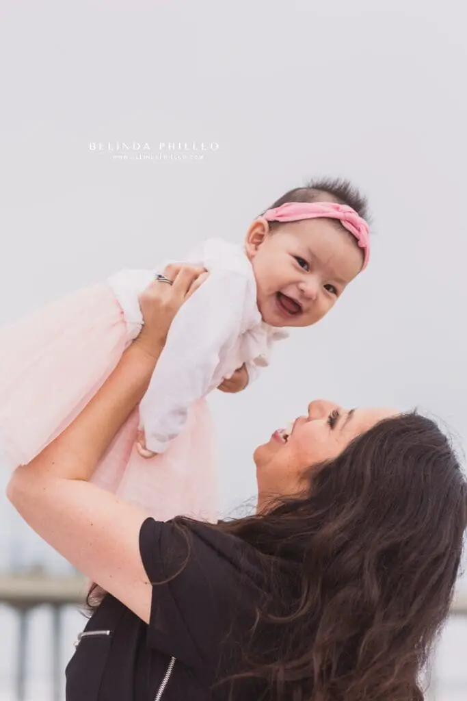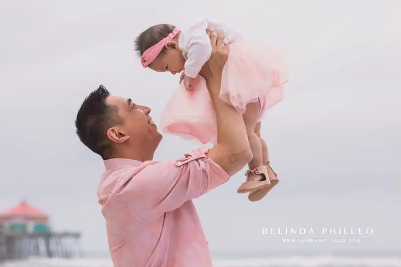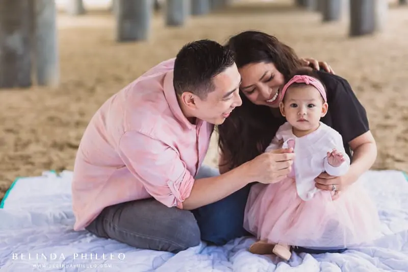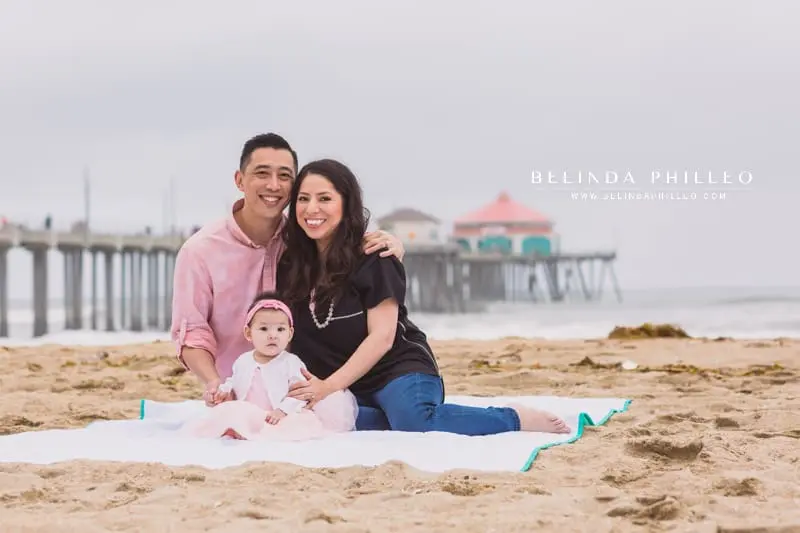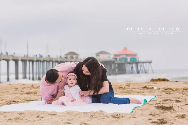 One such couple is Roy and Lorena. I previously photographed their engagement portraits and their beautiful wedding day in Pacific Palisades. While this lovely couple has since moved away, they contacted me recently to ask if I would photograph them during a business trip to California. They have a sweet little one now and they wanted to document her first trip to the beach. I was honored! What makes this session even more special is that it took place at the Huntington Beach Pier, where Roy and Lorena had their first date and their engagement photos way back when. Are you overwhelmed with the cuteness yet?