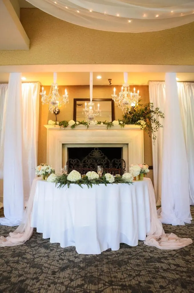 The upper ballroom features floor-to-ceiling windows, 17-foot ceilings, a baby grand piano in the lounge area (which is great for cocktail hour!), and a cozy fireplace that’s an ideal backdrop for the sweetheart table!