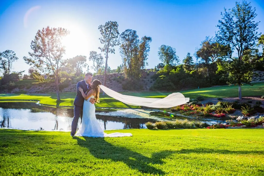 It’s also recommended that you schedule enough time to head over to the waterfall area with your photographer for some romantic shots by the water. Sunset is a great time for this series of shots because you get the golden light shining through and you can even get some photos with the clubhouse (and your reception) going on in the background for a nice storytelling effect!