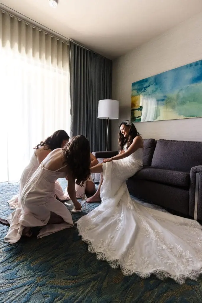 • A flatlay of bridal deatils with blush and ivory tones, including a blush and gold invitation suite, ivory Jimmy Choo shoes, and Chloe perfume