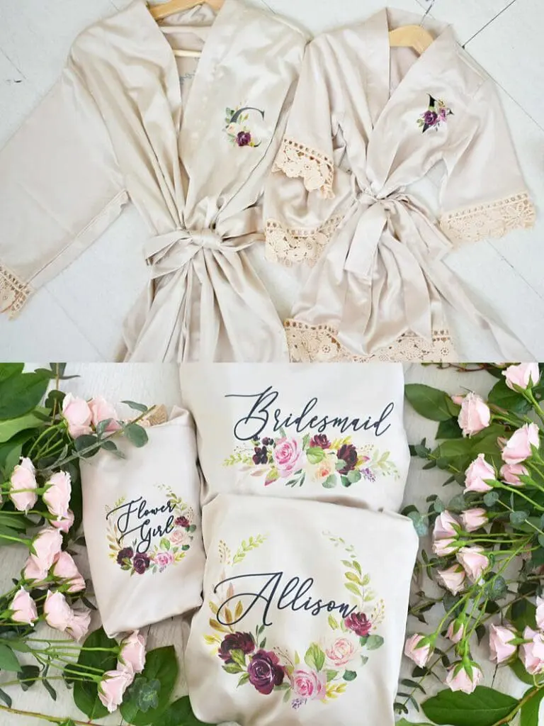Adorable kimonos are always a classic for bridesmaid gifts! I love this idea because not only does it make your morning prep pictures better on your wedding day, but it’s also something practical that your bridesmaids can re-use for lounging at home long after your wedding has passed! I found these beautiful rose patterned, customized robes by Blush Blossom Sugar on Etsy. They have incredible reviews. Check out Blush Blossom Sugar’s shop here.