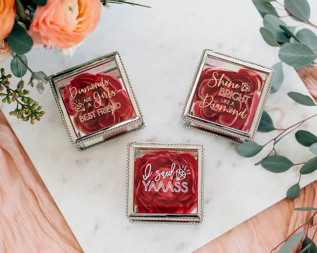 Another great option that our friends over at Happily Ever Etched offer is a gorgeous glass customized jewelry box. This box can be used to hold any number of small items, but I would definitely check out the jewelry option below as a great pairing for this gift!