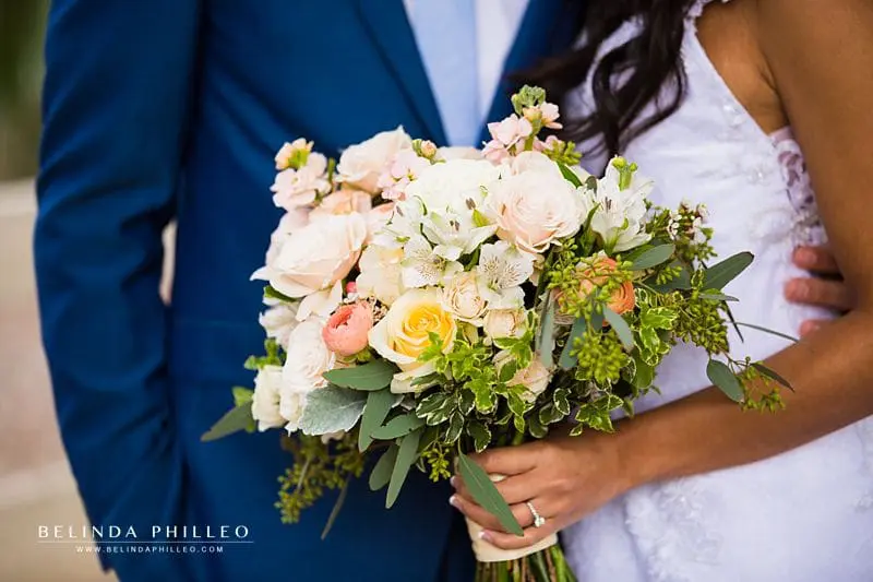 The couple chose a color pallet of navy blue for the groom and bridesmaid’s attire, and soft grey suits with blue ties for the groomsmen. The deep navy tone of the bridesmaid gowns, and grooms suit really made the light creams, pinks, and yellows in the florals pop and stand out. It was a great choice!