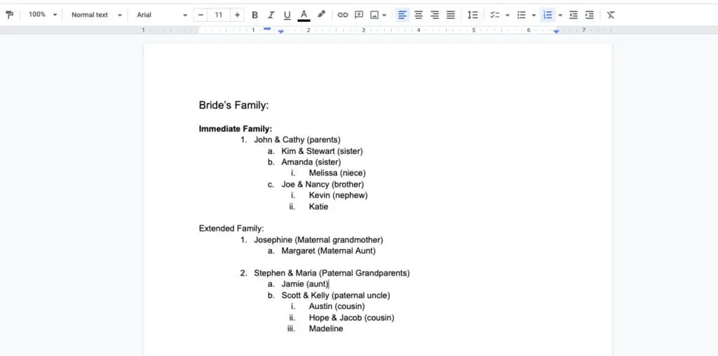 The easiest way to do this is to open a word document and list out each household. Since I create a family portrait shot list for each of my clients as part of our services, I have them format their family tree for me as shown in the example photo below: