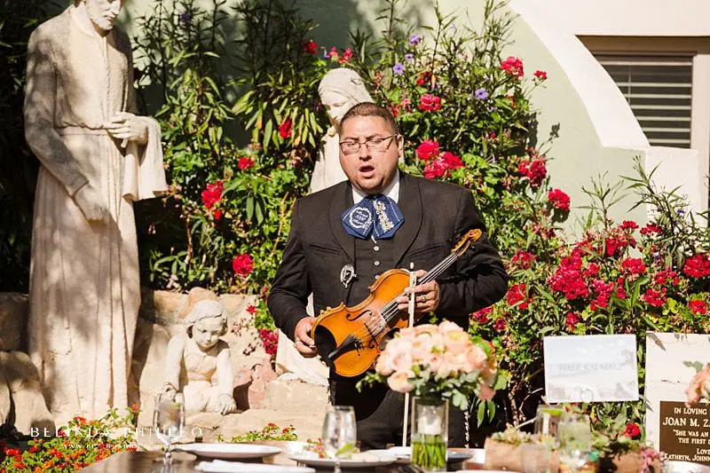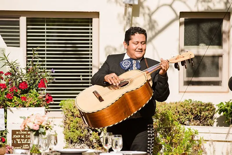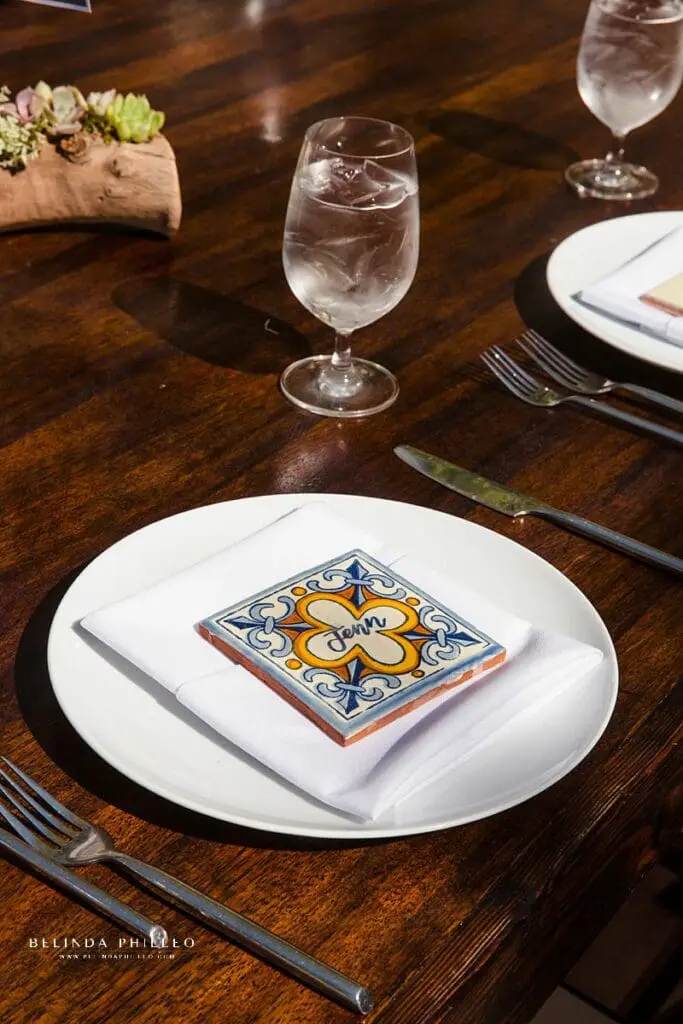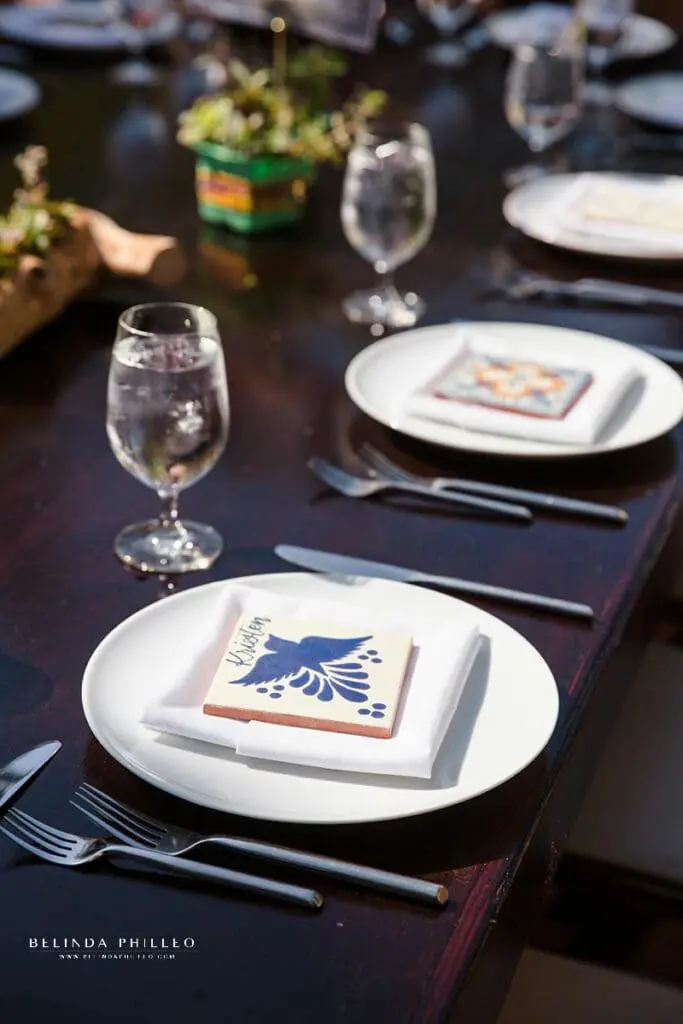 After the ceremony ended, guests were invited into an adorable fountain courtyard for cocktails and the reception. The decor was simple but elegant with farmhouse-style tables, adorable succulent centerpieces, and hand-decorated Spanish-style tiles as place markers. The couple also named each table after a place that held significance to them, such a sweet personal touch! Guests enjoyed fresh cocktails, lively conversation, a live mariachi band, and decorated fabric squares that would later become a personalized quilt for the couple.