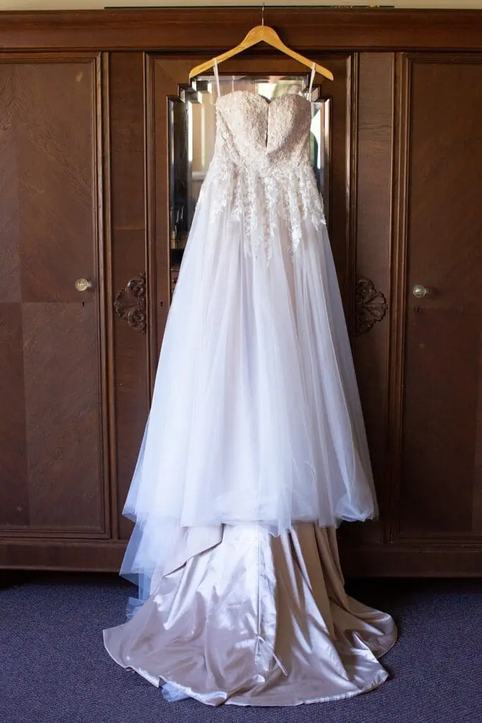 The Boffo Video team and I worked together to find the perfect spot to hang Emilie’s beautiful sweetheart neckline bridal gown. This armoire had such a nice look to it, and the light was great here too – this was our perfect spot!