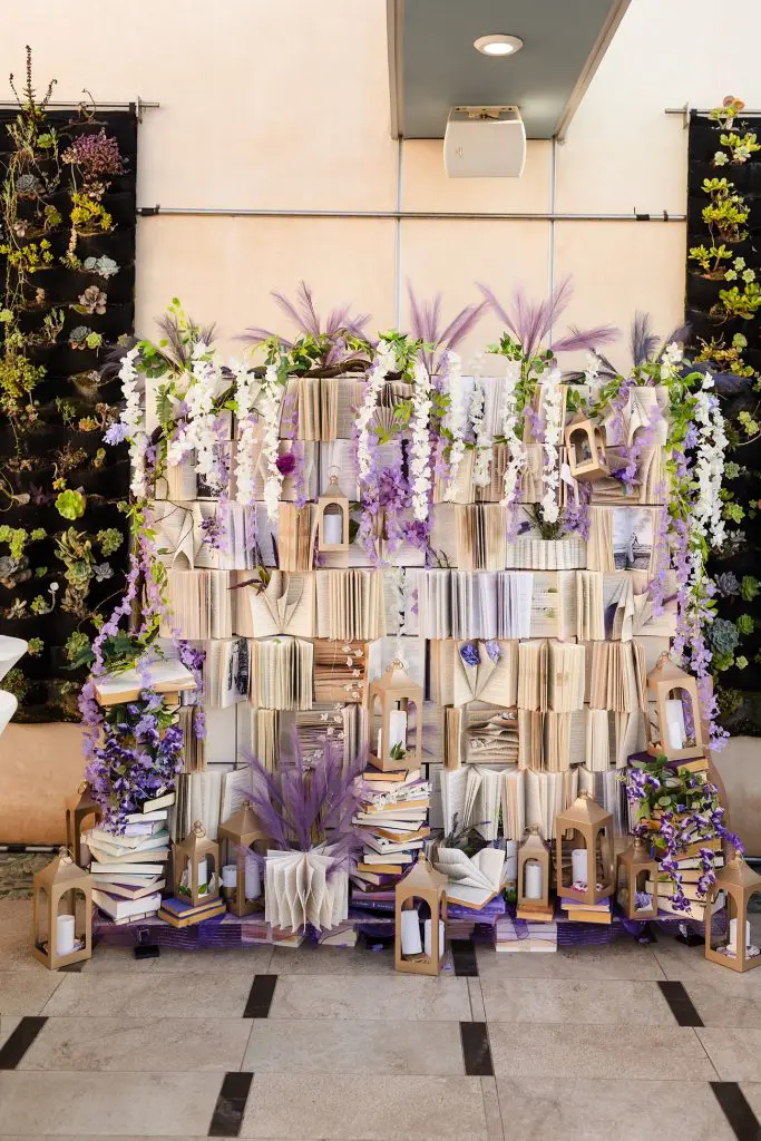 A friend of the bride created a stunning “book wall” made of actual books that served as a unique backdrop for guests to take photobooth style pictures.