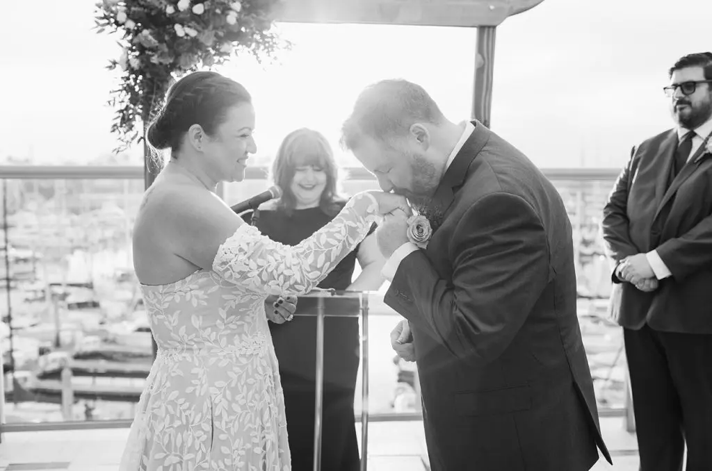 The day began inside the Shade Hotel’s modern, light-filled spaces – R in the blue room with her bridesmaids and M in a suite with the guys. Personal, thoughtful details were worked into every part of the day – from the customized ring bearer’s pillow, R’s ultra unique wedding ring, and the die used at the ceremony to determine who would say their vows first.