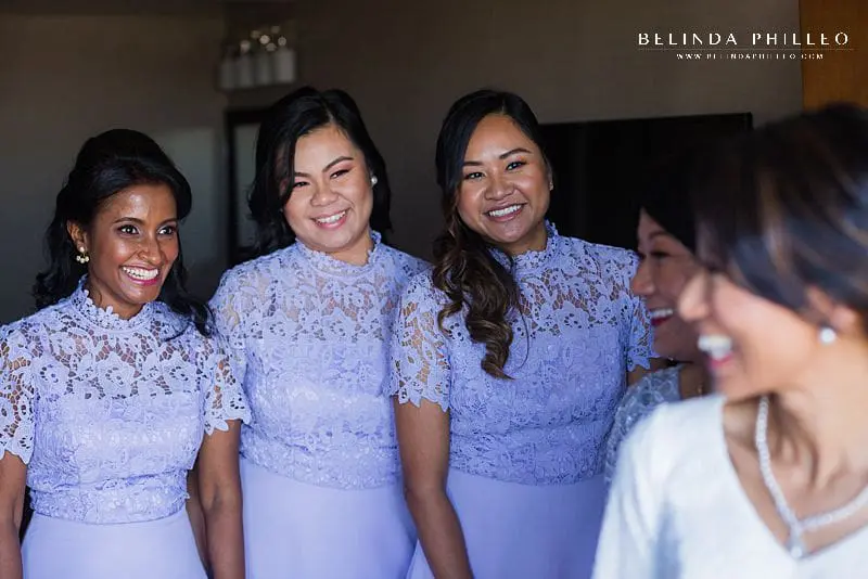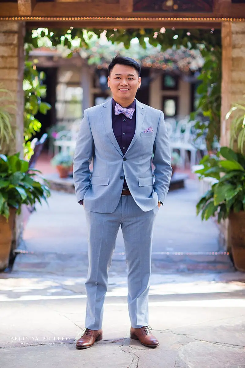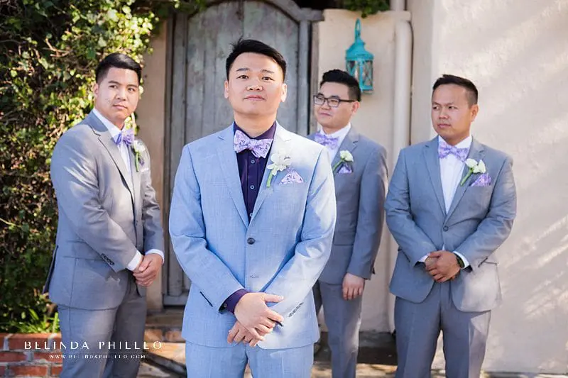 The groom and his groomsmen complimented the ladies well with their light blue-gray tuxes and colorful bowties that were full of character! David set apart his look by wearing a deep purple shirt; a unique but very stylish look for a groom!