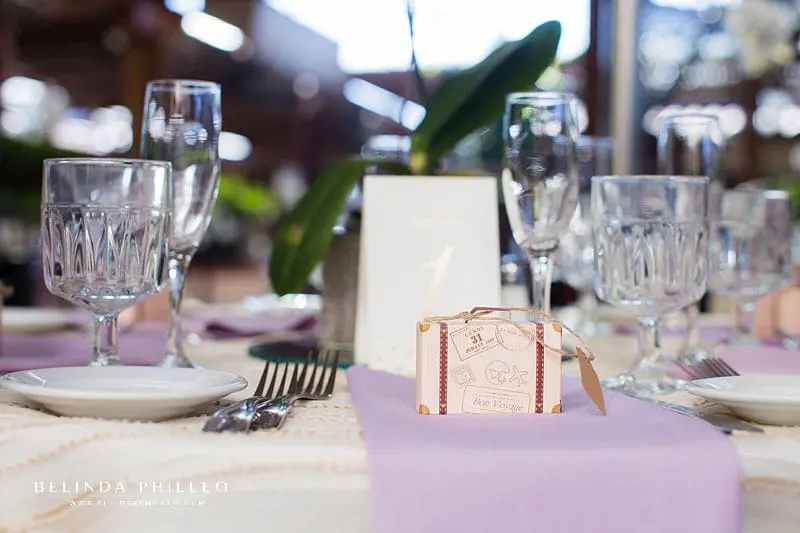 The couple chose a soft lavender and white color palette for their wedding decor. Naomi’s bouquet, as well as the reception centerpieces, were made of fresh white orchids; a simple and classy floral look that Sharen Cosbey of Flowers by Sharen pulled off well!